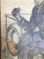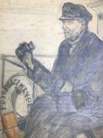 1934, город: Беломоро-Балтийский канал, формат: 40 х 52 см., состояние: Близко к хорошему. Надрывы, мелкие утраты по краю. . Александр Васильевич Скалон (1874—1942) — русский и советский художник и общественный деятель. Член ЛССХ. Ученик Императорской Академии художеств с 1894 по 1902 годы. 1 ноября 1902 года ему было присвоено звание художника за картину «В деревне». Принимал участие в выставках Императорской Академии художеств. Умер в 1942 году в блокадном Ленинграде. Скалон был дружен с Николаем Рерихом, сохранилась их переписка. В 1934 году с группой писателей и художников (Кукрыниксы, Иогансон, и др.) по инициативе председателя ОГПУ Г. Ягоды А. В. Скалон посетил строящийся руками заключенных Беломоро-Балтийский канал и стал одним из первых русских художников, прославивших в своем творчестве рабский труд. Надписи на портрете: ББК. Капитан "Розы Люксембург" Сергей Матвеевич Неслухов. Рис. А. Скалон. 24. IX. 1934.
