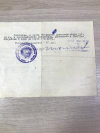 1946, город: Ленинград, стр. : 1 л., формат: 21 х 15 см., состояние: Хорошее. . Перцмахер Любовь Лазаревна, жена Перцмахер Бориса Ефимовича, умершего 20 июля 1942 г. является наследницей. Спецвклад в сумме 496 рублей. Подпись и печать нотариуса.