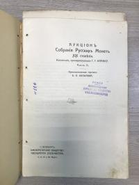 1910, изд-во: Изд. Б. Ф. Копылова, город: Спб., стр. : 38 стр. стр. + 10 стр., обложка: Издательская обложки, формат: Обычный ., состояние: Очень хорошее. Довоенный штамп Общества коллекционеров. Следы прокола при "переплетении". . Копылов Б. Ф. (1873 – 1913 гг.) купец 1-ой гильдии, нумизмат. Борис Фёдорович увлёкся монетами в начале ХХ века. Первой его крупной печатной работой явился аукционный каталог коллекции Г. Г. Бланка, состоящий из монет XIX века. Он также составил аукционный каталог русских монет и медалей и ряд других каталогов. По сути, он являлся подвижником аукционного монетного дела в России, которое тогда только развивалось. Издатель журнала "Старая монета". Сегодня все его издания считаются редкостью. Редчайший каталог, вышедший под эгидой "Императорского Общества Поощрения Художеств", с описанием и приложением цен ухода на 1344 лота. Бланк Герман Германович - знаменитый русский нумизмат, автор классического труда "Спутник нумизмата" Спб. 1904.