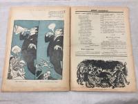 1917, изд-во: Тип. "Просвещение", город: Пг., стр. : 16 с., обложка: Мягкая издательская обложка, формат: Энциклопедический, состояние: Очень Хорошее. Журнал изначально с ненавистью относился к большевикам, но продолжал выходить и после октябрьского переворота 1917 г. Был запрещен только в августе 1918 года на 18 номере. Это одна из загадок цензуры того времени - более злобного и издевательского не выходило и на белой территории. (Одна из версий - личное отношение Ленина к Аверченко, Вождю нравился его юмор). Все номера "Нового Сатирикона" за 1917 г. довольно редки, особенно послеоктябрьские, так как были запрещены советской властью и уничтожались. (Блюм № 852) № 43 - Один из самых замечательных и смелых номеров журнала Аркадия Аверченко. Траурный номер - посвящен гибели Российской Империи, которая для Аверченко стала фактом уже через месяц позле захвата власти большевиками. Обложка: распятый Христос (Или Россия?) над типичным городским русским видом, охваченным пожаром. Стих. А. Рославлева "Кровь": Проливший кровь не смеет ждать/ любви и солнечного смеха: / Во век могильная печать /Во всем, везде ему помеха. . Эпиграф из Карла Маркса на 1 стр. : Гонение на печать, как и рабство, никогда не может стать законом, даже если оно тысячу раз существует в форме закона. - Аркадий Аверченко "За гробом матери": Плачьте, русские! - Рисунок В. Лебедева: Смерть с косой. На её улице праздник. - Бор. Мирский. Памфлет "Красный колпак" - Фельетон Арк. Бухова "Я саботирую" - Рисунок Ре-ми "Россия украшается". Сложенные в пирамиду гробы. Подпись: Пьедестал для статуи российской свободы по проекту Ленина и других Троцких. - Стих. А. Радакова "Конец" - В. Лебедев. Карикатура "Революционные отряды доброго русского народа". - Рис. А. Радакова. Повешенная Россия, с которой большевики - мародеры снимают сапожки. Другое. Необрезанный экземпляр в издательских обложках. Самый редкий номер 1917 г.