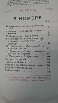 1934, изд-во: Издание Теа-Кино-Печати, город: Ленинград, стр. : 32с. Илл., обложка: Мягкая издательская обложка, формат: Увеличенный, состояние: Хорошее. Конец 20-х и начало 30-х гг. время полного подчинения искусства, в том числе театрального, которым увлекался и за которым внимательно следил сам Вождь, политике партии, которую олицетворял и формировал лично Сталин. Есть полемические статьи, оформление в ещё незапрещенном "конструктивистком" стиле, есть интересные фото. Обложка в "левом " стиле: Сцена из спектакля "Последние" - А. Гвоздев. Вооружение советского композитора - Непреодоленный формализм - В. Музалевский. Сила песни. Заметки о советской вокальной лирике - Ленинградские музыковеды обсуждаю выступления газеты "Правда".