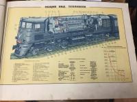 1966, изд-во: Транспорт, , город: Москва, стр. : 140 с., илл. + 2 схемы, обложка: Издательский переплет, формат: Очень большой, альбомный 35 х 47 см., состояние: Блок хорошее, комплектный, картонные обложки переплета потерты. . В красочно иллюстрированном альбоме представлена конструкция основных узлов тепловоза ТЭ3 (экипажная часть, дизель 2Д100, электрическое оборудование). Цветное изображение их сопровождается описанием устройства и работы каждого узла, а также краткими указаниями по его эксплуатации. В конце альбома показан рекомендуемый порядок осмотра и приемки тепловоза, приведены важные для локомотивной бригады сведения по устранению возможных неисправностей в пути следования, рассмотрены реостатные испытания тепловоза. Альбом является наглядным пособием при подготовке и повышении квалификации машинистов тепловозов и их помощников. К альбому прилагаются два красочных плаката. Схема электрического оборудования тепловоза. 62 х 90 см., Дизель 2Д 100 52 х 90 см.