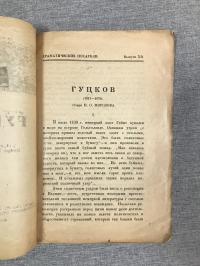 1919, изд-во: Издание Театрального отдела Народного комиссариата по просвещению, город: Пг. - М., стр. : 16 с., обложка: Мягкая издательская обложка, формат: Обычный, состояние: Хорошее, надрыв заклеен скотчем. . Марка серии и виньетка с портретом Гуцкова А. Белобородов Издано без титула. Карл Гуцков (1811 — 1878) — немецкий писатель и драматург, общественный деятель, глава литературного движения «Молодая Германия». Оформитель серии Андрея Яковлевич Белобородов (1886-1965) - художник, признанный архитектор, учился Н. Л. Бенуа и В. В. Матэ. Автор очерка - театровед, видный пушкинист Петр Осипович Морозов (1854-1920).