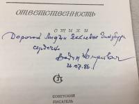 1986, изд-во: Советский писатель, город: М. -Л., стр. : 120 с., обложка: Мягкая издательская обложка, формат: Уменьшенный, состояние: Отличное. Автограф автора Л. Я. Гинзбург: Дорогой Лидии Яковлевне Гинзбург - сердечно. Вадим Халупович. Вадим Халупович Вадим Халупович, поэт, автор стихотворных сборников “Двери в рассвет” (1959), “И нет мне отпуска (1967), “Зимний полдень”(1974), “Урочный час (1981), “Ответственность” (1986), “Теченье лет” (Избранное, 1990), “Из дальнего города (1994), “Седьмая книга” (1994), “Пристальное зрение”(1999). Член Союза писателей СССР, член Союза писателей Израиля, член международного ПЕН-клуба. Репатриировался в Израиль из Петербурга в 1992 году. Живет в Хайфе. Лидия Яковлевна Гинзбург (1901 -1990), крупнейший литературовед СССР, масштаб ее фигуры проявился только в XXI веке после публикции ее дневниковых и мемуарных записей.