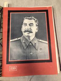 1953, изд-во: Правда., город: М., стр. : 32 с., ил. в №., обложка: В трех любительских переплетах., формат: Энциклопедический, состояние: Очень Хорошая сохранность. Единственный дефект: в № 14 утеряна половина последнего листа, стр. 31-32. НЕ библиотечные номера. . Годовой комплект из 52 номеров, с всеми передними и задними обложками и иллюстрациями на отдельных листа. Два траурных номера о смерти и похоронах Сталина в безукоризненном состоянии. Об аресте Берия главный редактор Огонька А. Сурков не напечатал ни слова, а вот славословия о Сталине исчезли практически сразу после похорон, но в приплетенном к № 35 годовому содержанию не пропущены статьи о Вожде за январь и февраль (Валентин Катаев. За великого Сталина! , А. Твардовский. О Сталине. и др.) В номере 25 одна из первых публикаций Евгения Евтушенко "Крылья".