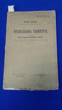 1910, изд-во: Общественная польза, город: Спб., стр. : 213, 2 н. с., обложка: Издательская обложка, формат: Увеличенный, состояние: Хорошее, НЕ библиотечная, НЕ обрезана. . Прижизненное издание. Роберто Бонола (1874 —1911) — итальянский математик, Содержание: Доказательства 5-го постулата. Предшественники неевклидовой геометрии (Саккери, Ламберт, Лежандр, Больяи, Вахтер) Творцы неевклидовой геометрии (Гаусс, Швейкарт, Тауринус, Лобачевский), Абсолютная тригонометрия. Распространение неевклидовой геометрии. Исследования Римана, Гельмгольца, Софуса Ли. Приложения. Рассмотрение задачи Клиффорда - Клейна. Построение неевклидовой параллельный и другие относящиеся сюда построения. О независимости проективной геометрии от 5-го постулата Евклида. Основные принципы статики и евклидов постулат. Экземпляр из библиотеки В. В. Плакса, с его печаткой на титуле. Плакс Владимир Васильевич (Вильгельмович) (1883–1942). Он был преподавателем математики Всероссийской Академии художеств, погиб в блокадном Ленинграде.